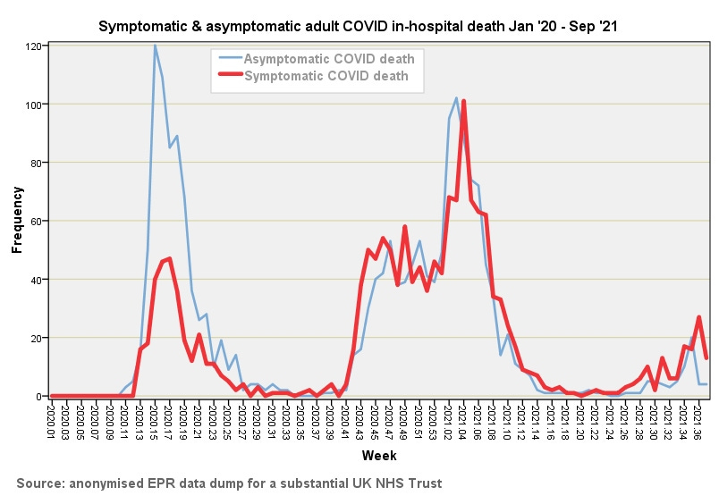 Again we observe a striking match, with the most significant difference being an excess spate of COVID deaths within the Trust between 2020/w41 and 2020/w53 (slide #2). This may be a localised outbreak, a policy change, a protocol change, a run of excess false positives or something else entirely. The main result here is that the pattern of COVID in-hospital death within the Trust under study mirrors the wider world. With confidence tucked into our back pocket we can now proceed to roll the time series for symptomatic and asymptomatic COVID death within the Trust to see what can be seen…
