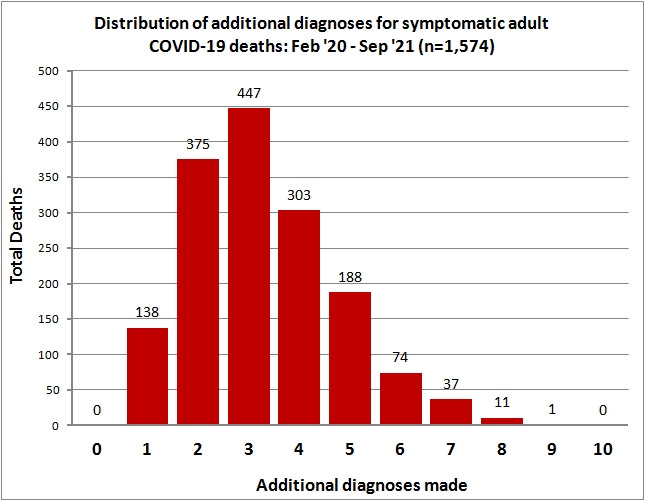 Now this is a sizzling surprise! We discover that none of the 1,574 symptomatic COVID deaths can be attributed to SARS-COV-2 infection alone, which dunks us right into the murk tank of multicausal death. Announcing that all 1,574 symptomatic COVID deaths are multicausal at this point is a bit strong since we need to pick over the fine detail of the patient record – we have no idea whether any of these additional diagnoses are potentially causal (e.g. stroke) or a comorbidity (e.g. high blood pressure). Nevertheless, I hope this slide reveals just how murky the COVID waters are, for 67.4% of symptomatic COVID deaths exhibited patient records with three or more additional diagnoses and a staggering 91.2% of symptomatic COVID deaths exhibited patient records with two or more additional diagnoses.