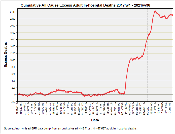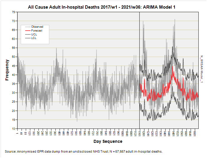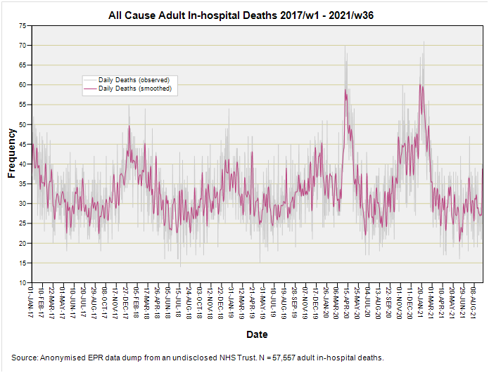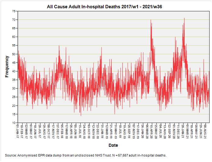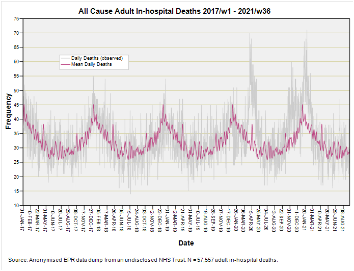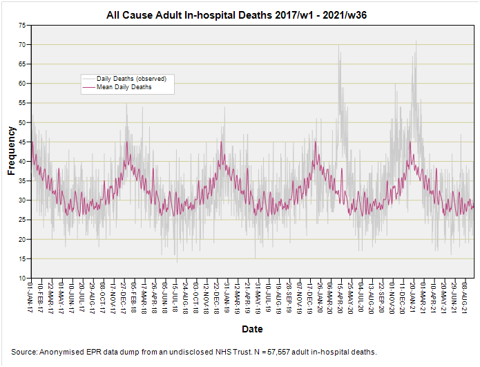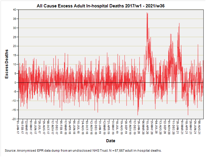 I investigate a sample of 57,557 adult in-hospital deaths for the period 2017/w1 – 2021/w36 for an undisclosed NHS Trust with a view to estimating ‘internal’ excess death