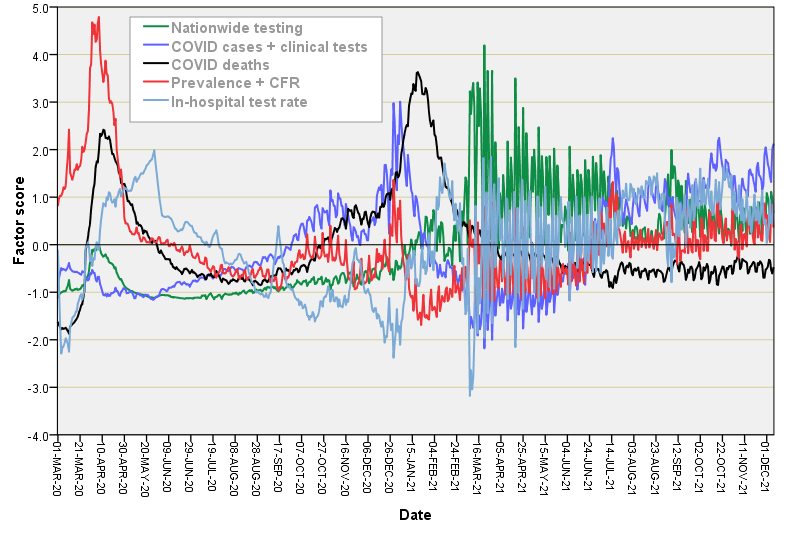 We started with 38 raw variables and ended with 5 orthogonal factors that explain 93.4% of the variance structure. That ain’t bad going! The 5 extracted factors were given the titles of: nationwide testing, COVID cases + clinical tests, COVID deaths, prevalence + CFR, and in-hospital test rate; herewith a colourful plot of how they vary over time: