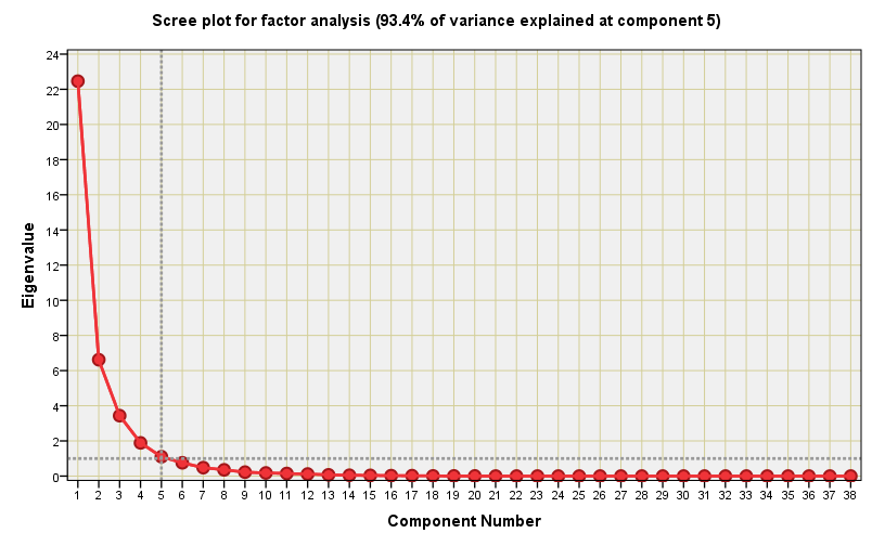 To bake this cake I opted for the classic approach of principal components extraction for eigenvalues greater than 1.00 with varimax rotation of the solution. I struck lucky because just 5 orthogonal components were needed to explain 93.4% of the total variance within the 38-dimension dataset. I love scree plots, so here is a corker with a well-defined elbow: