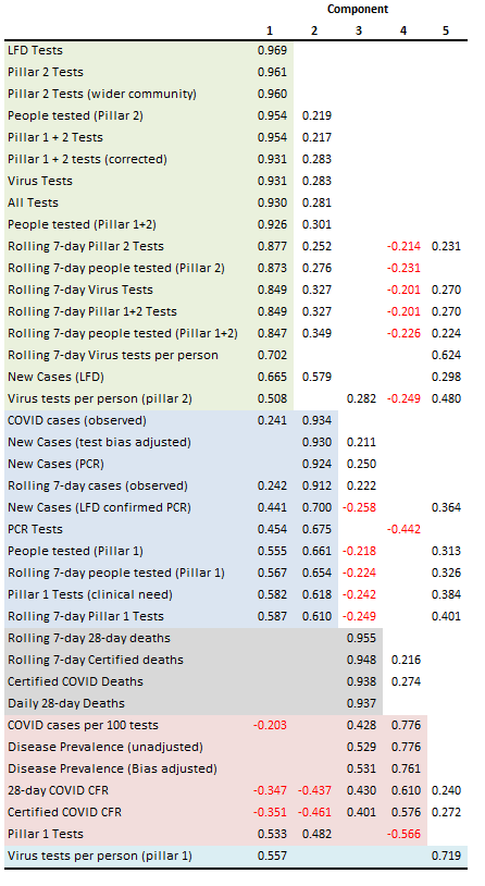 The rotated solution offers some intriguing insights for which we may munch our way through a few biscuits. I’ve highlighted the key sections in fetching pastels starting with pale green for what is a grand collection of all those variables connected with testing in the wider community (pillar 2). These dominate matters, and particularly so after the introduction of the lateral flow kits and mandates for the education and employment sectors.