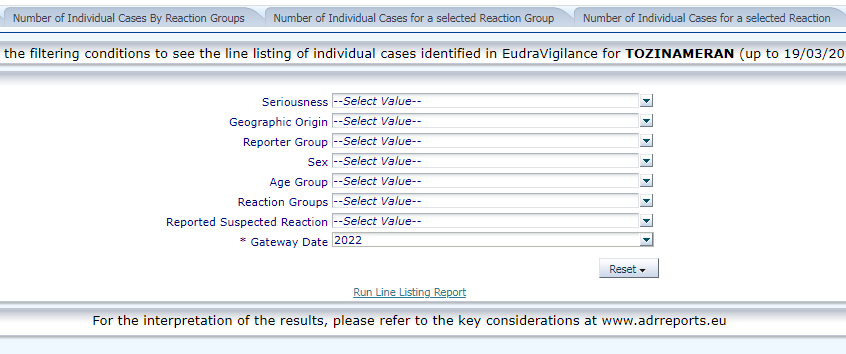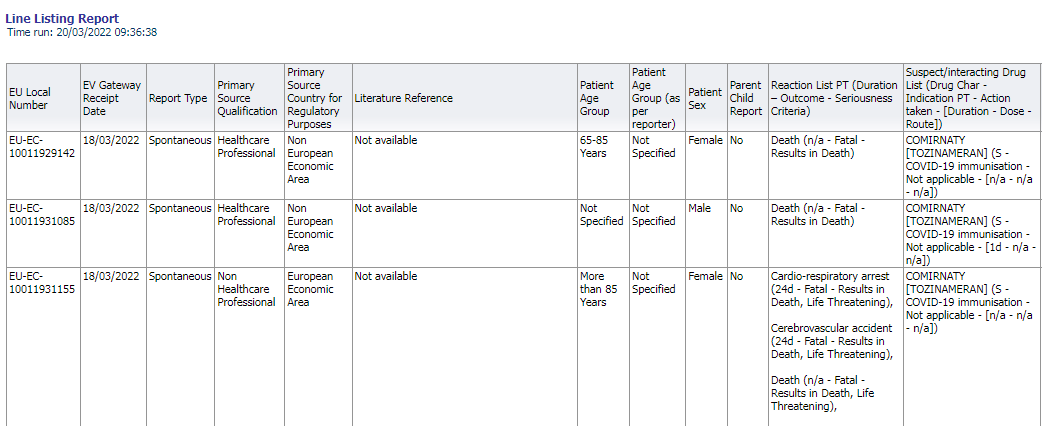 You can then enter keywords of interest; in this example I opted to search for ‘death’. Death comes in different flavours including apparent death but please do remember that even by choosing every single death option you will not get a listing of all deaths - all you get is a listing of deaths in which death has been coded as a reaction outcome (around a quarter of all fatal outcomes have death recorded as a reaction and that way we get around this will be explained below). Hit the hyperlink Run Line Listing Report and you’ll get something like this…