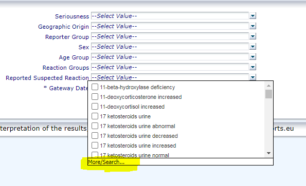 After that it’s up to you! If you open Reported Suspected Reaction you’ll get a massive drop down that is pretty much pointless. Instead of scrolling forever and a day I suggest you click on the More/Search… option…