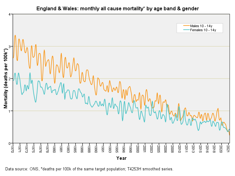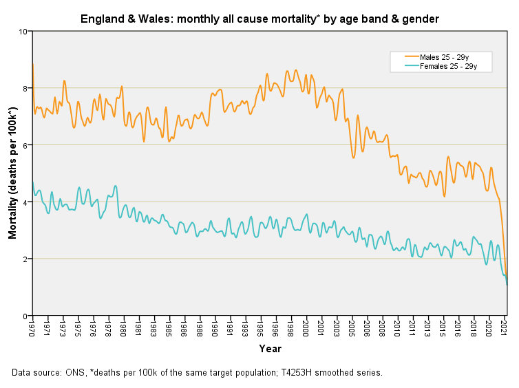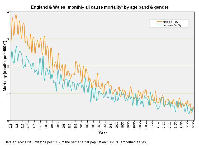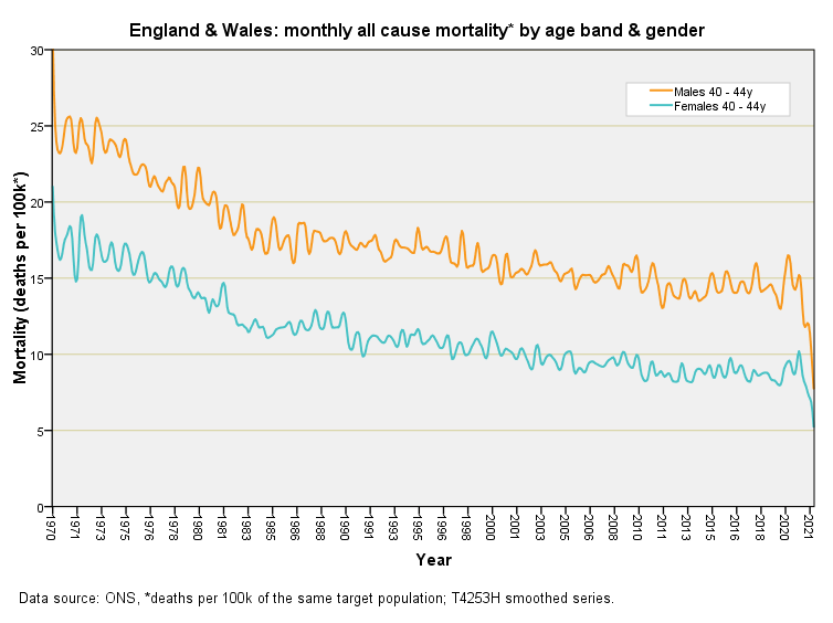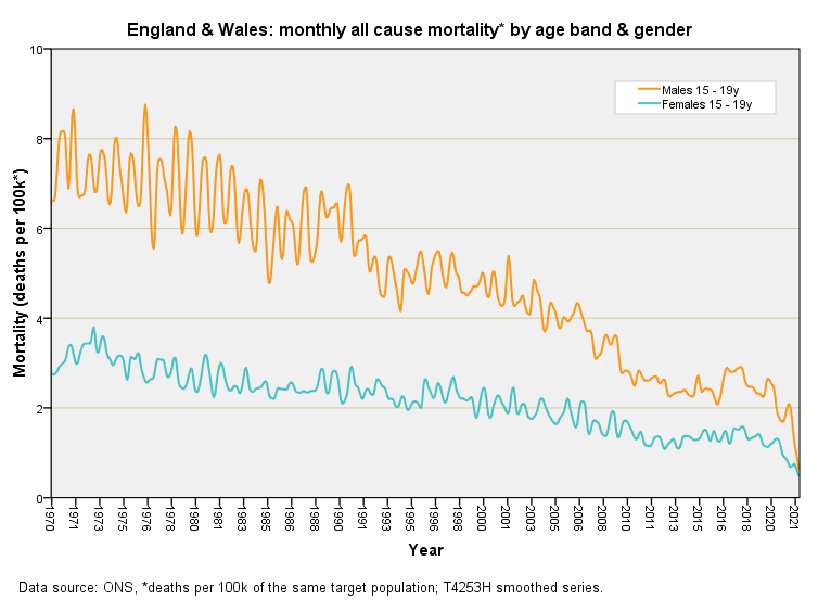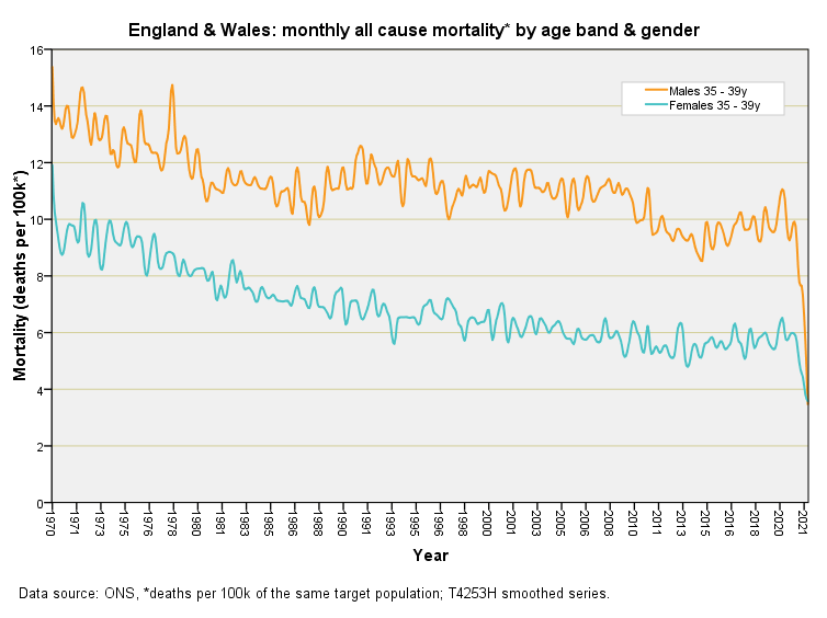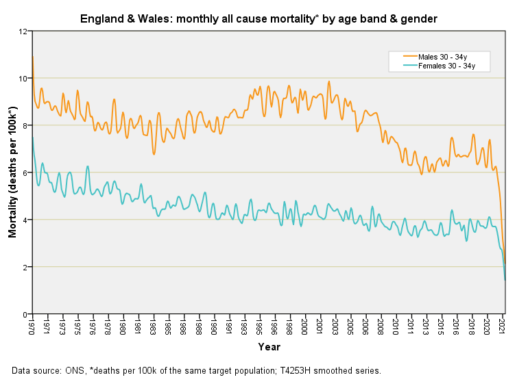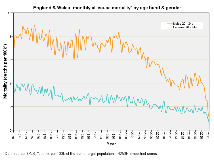 As promised, herewith a set of 9 slides that permits direct comparison of males and females. In order to do this and avoid producing a right-old Jackson Pollack I’ve smoothed the data series using the Tukey-Hanning 4253H smoothing function. Interested folk may read about this technique here, otherwise get that kettle on, maybe slice some cake and enjoy the views. The drooping tails during the latter part of 2021 are almost certainly due to delays in processing of death certificates and folk should be wary of any organisation claiming outrageous vaccine benefits for the youth of today using such incomplete data.