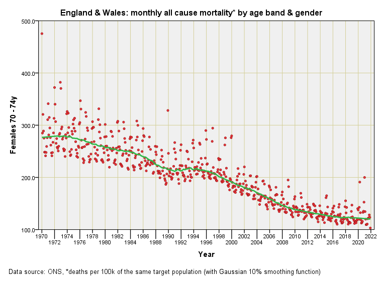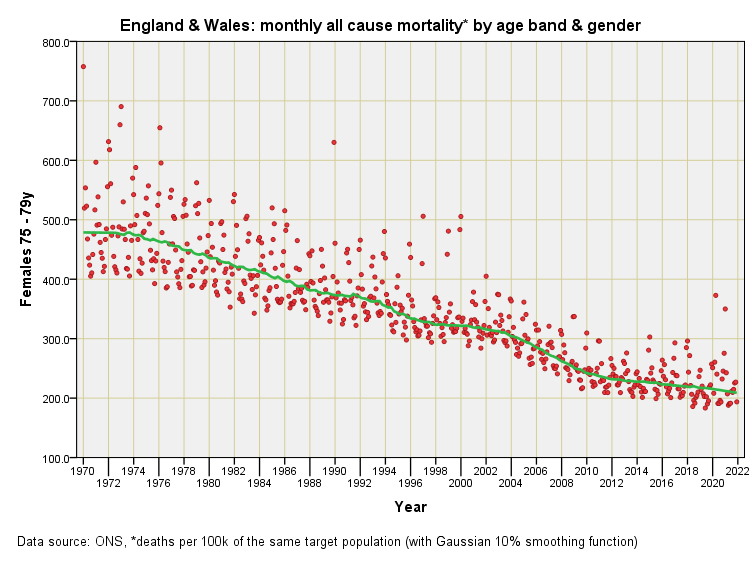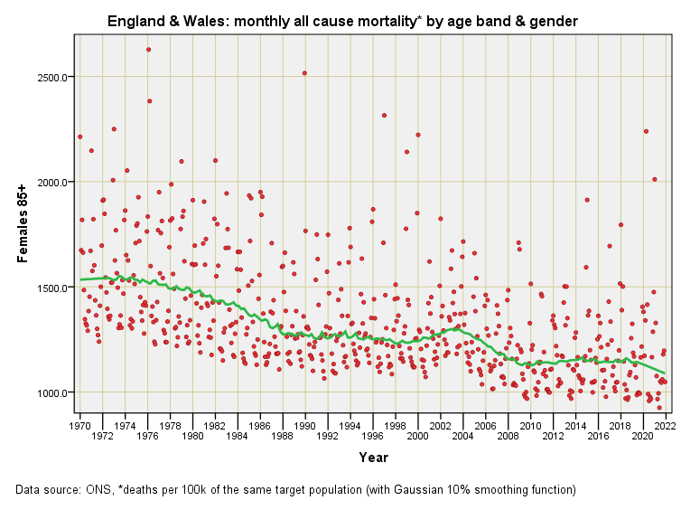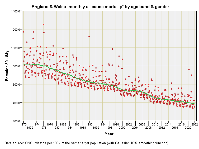 Herewith the final nine slides in this opening series. In parts 5 & 6 I shall smooth this data so we may compare males and females directly. It is worth noting that the various series that I am baking in this er… series are monthly mortality rates and are not to be confused with yearly mortality rates that are commonly produced - for one thing they are approximately twelve times less!