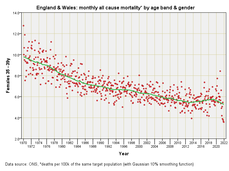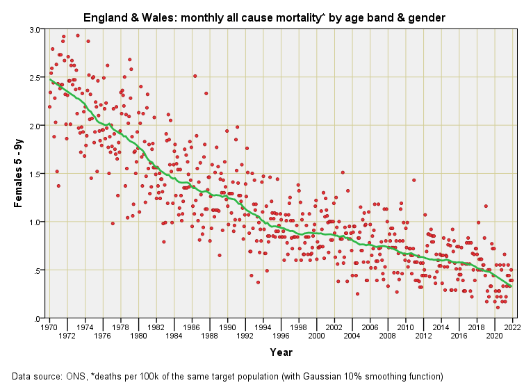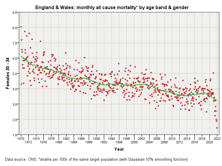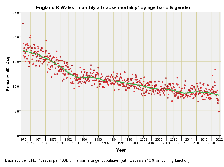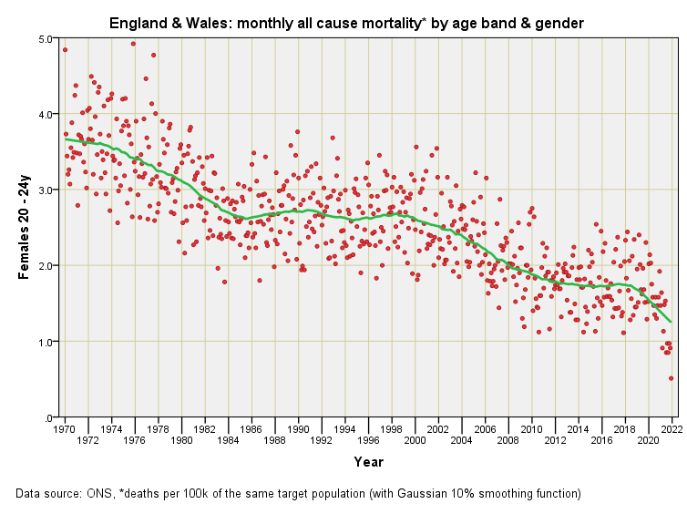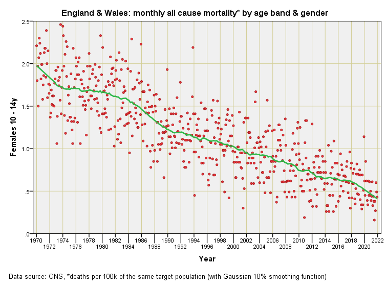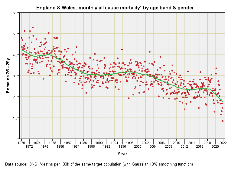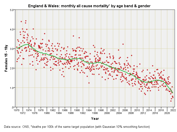 I shall once again restrict my commenting to features that catch my eye. Get the kettle on, open the biscuit tin and have a feast on these but be aware of changes in the y-axis scaling when comparing with males and other age groups. I will run a smoothing function through these many and varied data clouds so we may more easily compare males and females in parts 5 & 6.