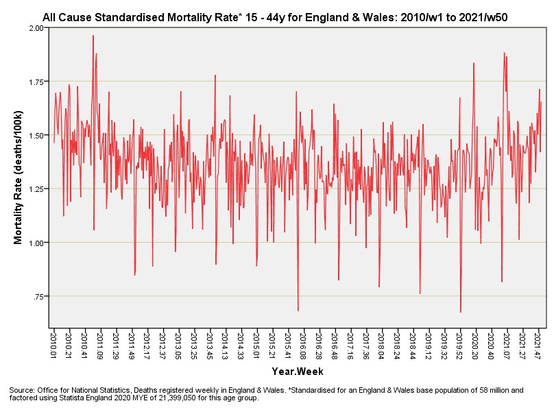 I’ve a figure of 21,399,050 head of population for the 15 – 44y age band (Statista 2020 MYE for England); assuming the proportion of young adults has remained largely invariant over the last decade we can then produce a first crude estimate for SMR and here it is…