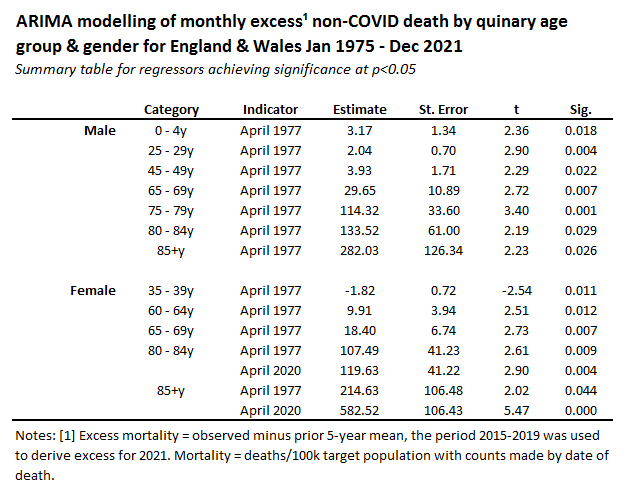 What I’ve baked up this morning is automated ARIMA modelling of monthly excess non-COVID mortality by quinary age group and gender for the period Jan 1975 – Dec 2021 using dummy indicator variables (regressors) for April 1977 and April 2021 to see who was experiencing a hit on health during these two periods. The results are somewhat intriguing and I shall reveal them using a simple summary table instead of churning out piles of statistical output.