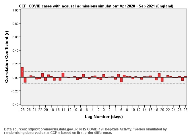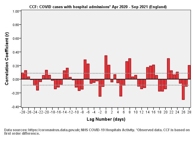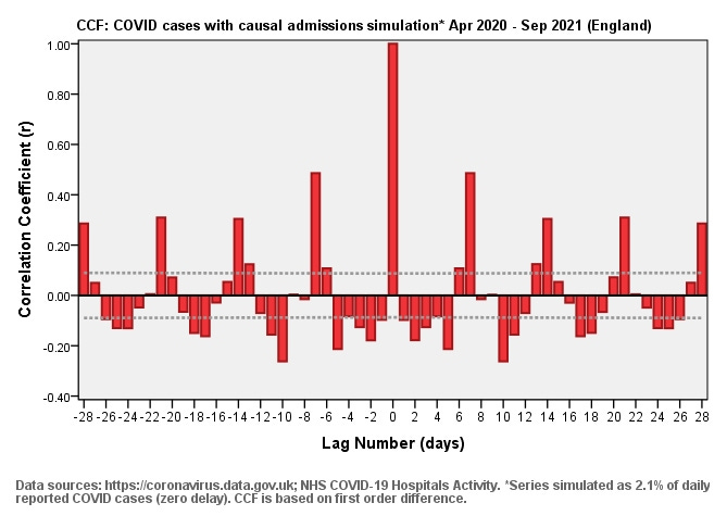 So how can we tell if hospital admissions are being driven by daily cases in a causal manner? One way is to study the medical records of those 137,547 folk to determine their primary reason for admission; another is to resort to simulation and run data through cross correlation (CCF).