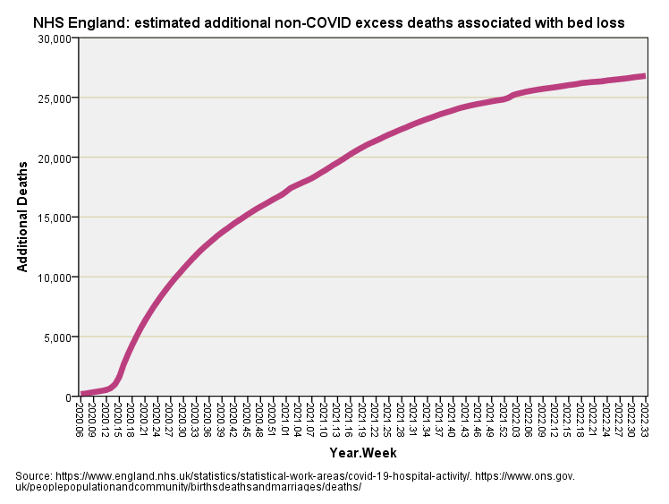 My modest ARIMA model indicates that the cumulative count of additional deaths associated with bed loss is currently standing at just over 26,000 deaths. We should note that these are true excess deaths; that is, they’re deaths adjusted for both seasonal effects and certification error. We should also note these are non-COVID deaths so represent only part of the sorry picture.