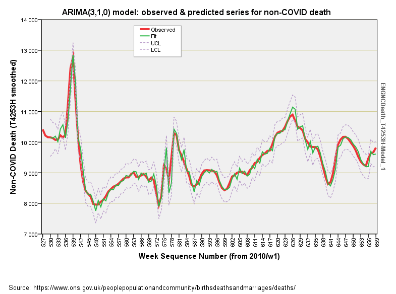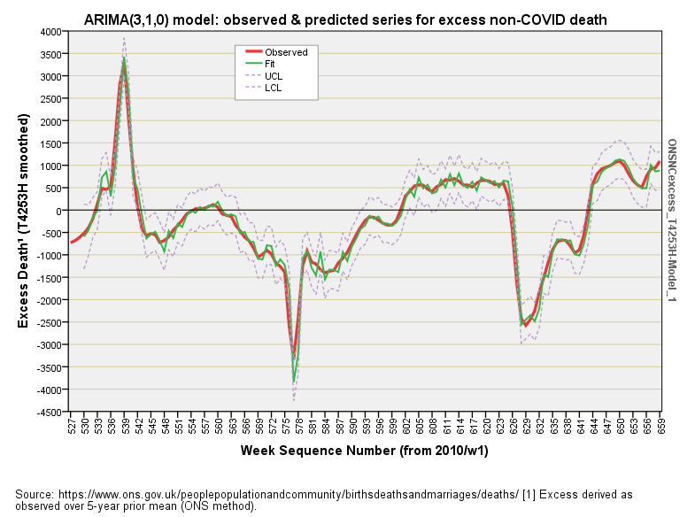 Herewith the best fitting ARIMA model for the prediction of T4253H smoothed excess non-COVID death that I can muster as things stand this morning. I appreciate that T4253H smoothed excess non-COVID death is a bit of a mouthful but it’s all very simple really… I’m having a look at non-COVID deaths since the pandemic began that have been adjusted for seasonality (hence excess) and administrative hiccoughs (hence smoothing):