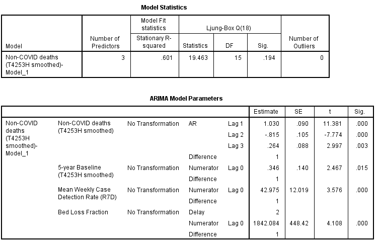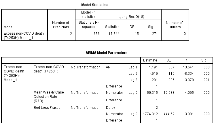 This brings us once again to the time series for bed loss fraction, which once again drops out as a highly statistically significant predictor of non-COVID death when lagged by 2 weeks (p<0.001). We should note the similarity of the associated coefficient (1842.084) with that derived from the first model (1774.312), which is most pleasing. The pudding is also equally tasty:
