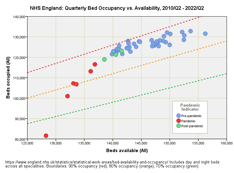 As well as colouring the primary pandemic phases I have taken the liberty of adding three coloured lines representing levels of 90% occupancy (red), 80% occupancy (orange) and 70% occupancy (green). The curvy relationship we observe is rather splendid and from this we may glean that NHS managers have historically attempted to keep occupancy between 80% and 90%.