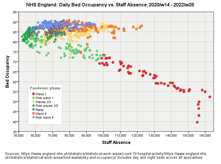 That cloud of sustainability starts to break down as we move back into the post first wave (light green) and first wave (red) periods. These are mighty interesting to contemplate, for during the post first wave period we observe normal levels of staff absence but depressed levels of occupancy. I am going to suggest this arises from a combination of fear (patients avoiding hospitals) and a necessarily gradual return to a full quota of routine services and elective procedures, the limiting factors being things like consultants, theatres and treatment rooms. The horseshoe shape of the main data cloud suggests service resilience at absence levels up to 120,000 staff per day, the ‘norm’ being 60,000 - 90,000 absences per day. It would be wonderful to plot this out for pre-pandemic periods for comparison but that data are not publicly available.