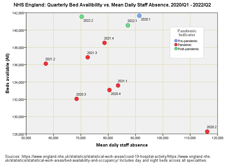 We don’t see anything other than a seeming random scatter of points in which mean daily bed availability and mean daily staff absence bob about nonchalantly in a sea of variance. A Pearson bivariate correlation confirms this with a statistically insignificant r = 0.319 (p=0.402, n=9), but what does this mean in plain English? It means that, with the exception of 2020/Q2, there is no obvious relationship between staff absence and bed availability. This situation would come about if staff absences were normally running below a critical threshold; that is, if there were enough hands left on deck to manage the sheets without the need for strategic bed closure.