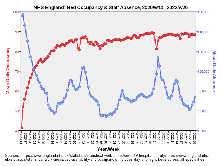 Here we see a mirror-like dance of daily occupancy in red (total beds occupied / total beds available) with mean daily staff absence for weeks covering the period 2020/w14 - 2022/w26 that makes the point of staff = beds most eloquently. Those who like numbers may wish to note the Pearson bivariate correlation coefficient of r = -0.629 (p<0.001, n=820).