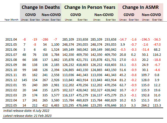 The Office for National Statistics released the long-awaited deaths by vaccination status data today. If we compare the two national snapshots using data provided in table 1 we find large increases in deaths and person years for the overlapping period of Apr 2021 - May 2022 plus some changes in ASMR: