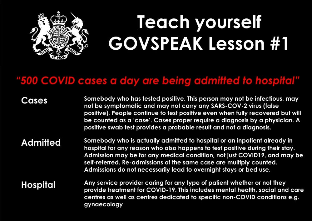 One of the trickier issues that can clobber any analysis is taking data at face value. By now I hope regular subscribers to my newsletters will have noted how weird little details and definitions sitting down in the fine print can snag the unwary. My favourite has got to be the daily count for COVID admissions to hospital, where we learn that ‘COVID’ does not necessarily mean sick with flu-like symptoms or even carrying any virus (false positive), and where ‘admission’ includes re-admissions as well as folk turning up in A&E under their own steam (and does not necessarily end in bed use, whether day or night bed), and where ‘hospital’ does not necessarily mean to a service provider that actually treats COVID cases (e.g. maternity or mental health unit). Those who have read some of my more formal reports will also recall that positive-testing admissions with flu-like symptoms may also be sent home the same day! People usually stand with an open mouth and puzzled expression when I relate the reality of the daily count - what it actually means - and to this end I produced this popular slide: