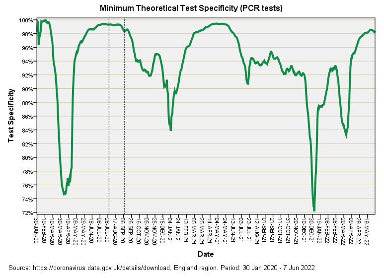 I’ve marked their 6 week reference window with dashed lines and we may note that they chose a time when disease prevalence would have been minimal and people generally happy in the sunshine. The figure I obtain for the period 31 Jul - 10 Sep using the rolling 7-day method bounces between a minimum specificity of 98.32% and maximum specificity of 99.33%, with a mean of 99.12%.