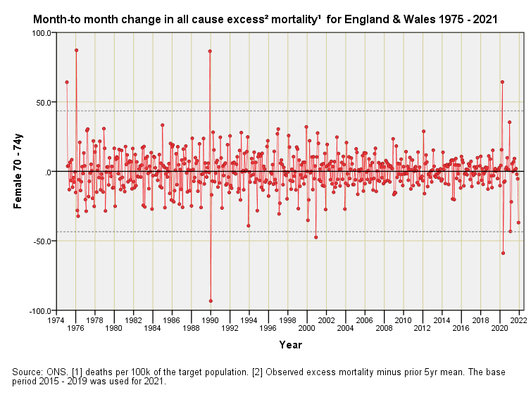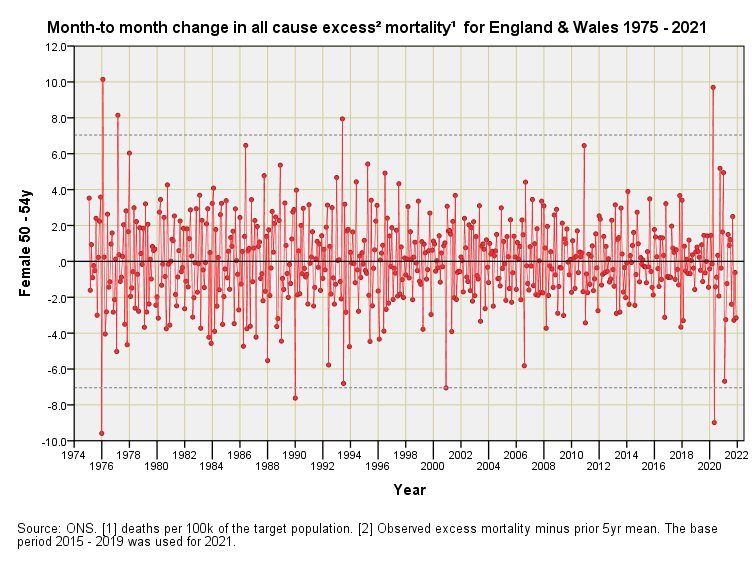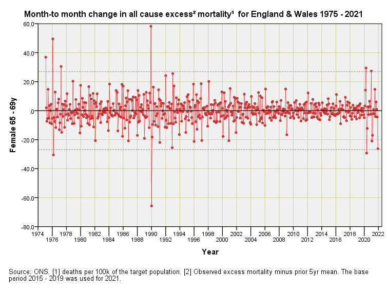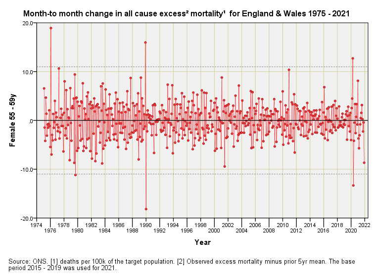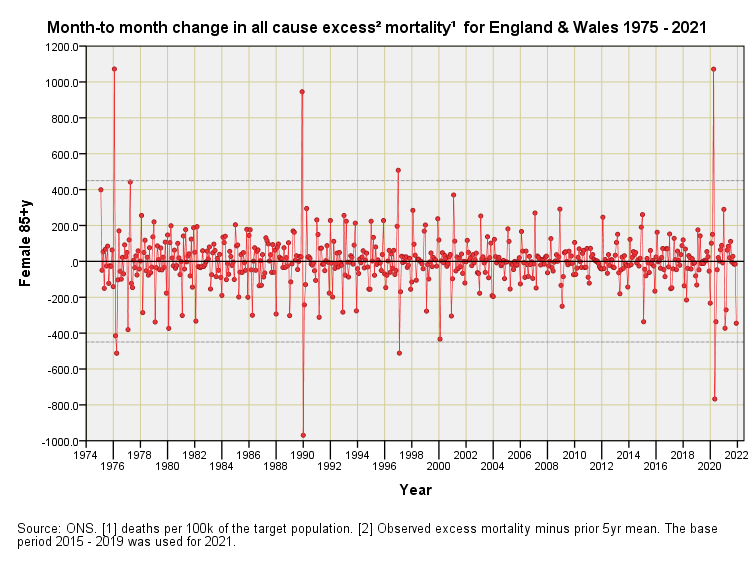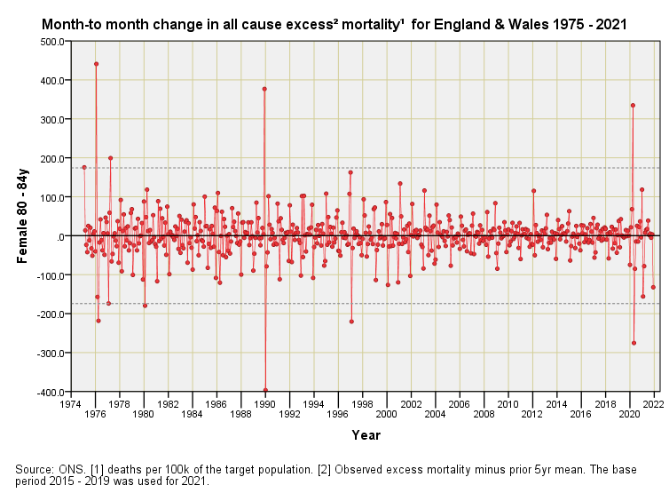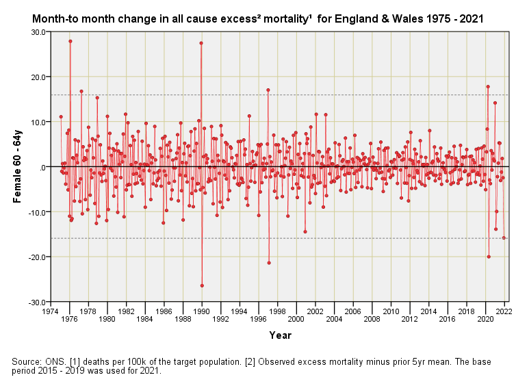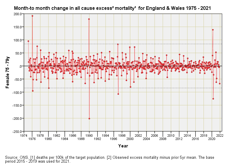Mortality Impact 1975 – 2021 (part 4)England & Wales differential monthly excess mortality by quinary age band & sex: females 45+yJohn DeeMay 25, 202216ShareFor an explanation of these charts please refer to part 1 of this series.PreviousNext