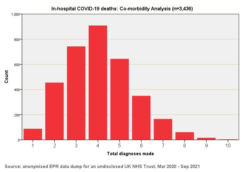 During this period a total of 3,436 COVID-19 deaths were registered across the NHS Trust and the distribution of comorbidity in terms of total diagnoses made is attached. The data dump provided ICD10 coding for ten registry fields which is why this chart runs to a maximum of ten possible diagnoses. Mean and median age was 79.7 years and 82 years respectively.