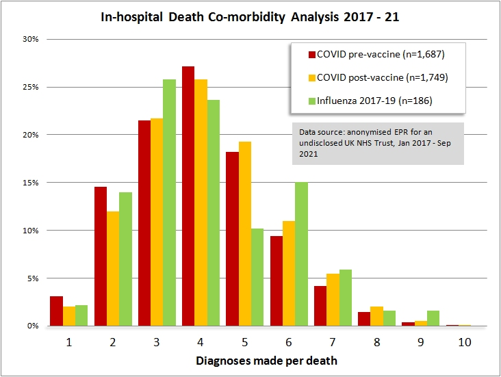 In yesterday’s post I revealed the distribution of the diagnostic count made per death for 3,436 positive-testing in-hospital deaths occurring within an undisclosed UK NHS Trust over the period Mar 2020 – Sep 2021. Some excellent points were made by members that encouraged me to enhance the analysis by looking at COVID death in the pre- and post-vaccination periods as well as influenza prior to 2020. Here are those ideas bundled into one colourful bar chart.