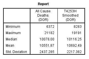 The most notable differences lie with minima and maxima and, as expected, the smoothing function has pulled in the reins, as it were, with a larger minimum and smaller maximum. The median is arguably a more important statistic and we may note a difference of just 38.25 deaths (0.38%), with the mean offering a difference of 140.62 deaths (1.33%). These are minor differences I reckon I could live with, with a paired samples t-test indicating borderline significance for mean differences (p=0.055).