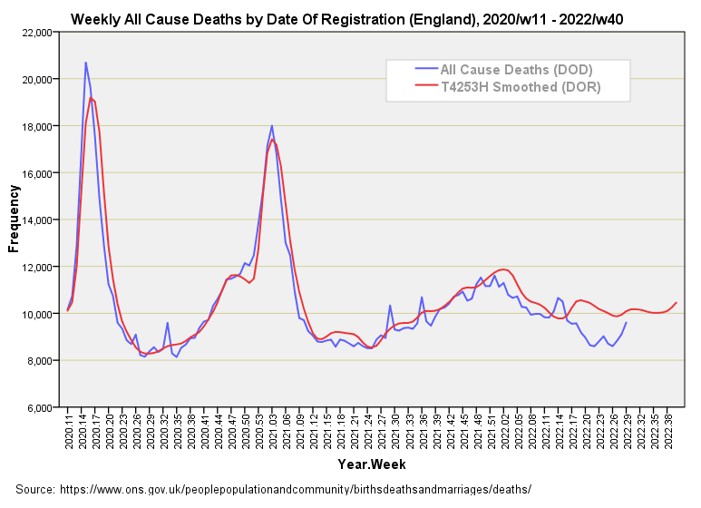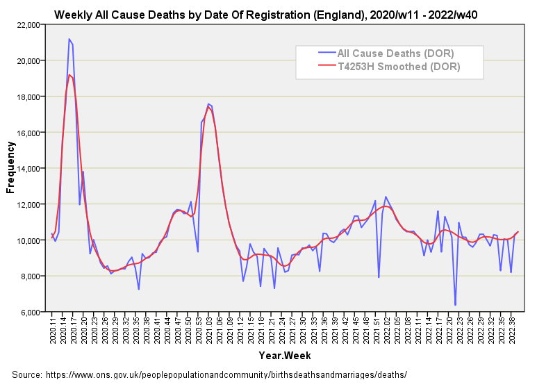 Without further ado herewith a time series plot for weekly all cause deaths in England by date of registration (DOR) for the pandemic period of 2020/w12 – 2022/w40, together with the T4253H smoothed version: