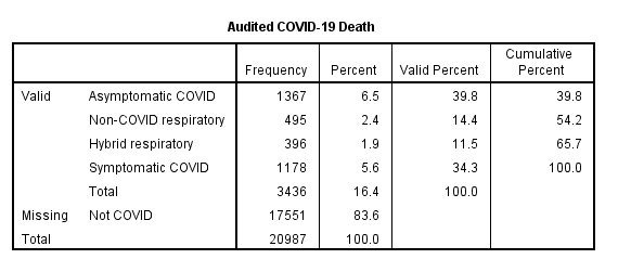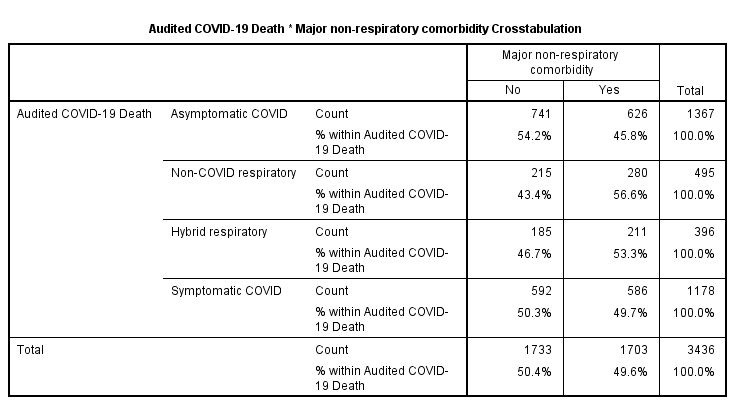 Of the remaining 3,436 positive-testing deaths we find 1,367 (39.8%) with absolutely no sign of any respiratory illness (asymptomatic cases). We also observe a further 495 deaths (14.4%) who died with a non-COVID respiratory condition (e.g. bacterial pneumonia), this bringing the total to 1,863 deaths (54.2%). At this point we may draw the sobering conclusion that the majority of COVID-positive deaths were not COVID causal - causal in the sense that COVID must lead to an acute respiratory condition rather than just a cough.