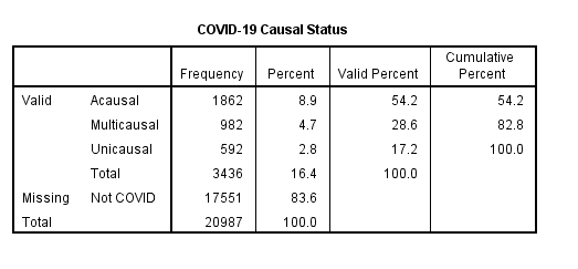 What we need now is to finish with a very simple table to sum causality in a tidy manner. Using table #2 I have concocted a crude causality indicator for positive-testing in-hospital death. This declares COVID deaths to be acausal (no respiratory condition), multicausal (more than one major morbidity potentially contributing to the cause of death) and unicausal (a COVID death that can be attributed solely to severe SARS-COV-2 infection). With just 17.2% of COVID deaths sitting under unicausal it is high time to get that kettle on methinks and allow clinicians to argue over those multicausal cases…