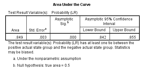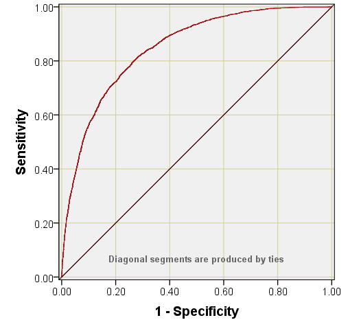 Thus we observe a true negative rate of 95.9% which is excellent, and a true positive rate of just 34.1% which is rather poor but pretty much par for the course when it comes to predicting incidence of disease states for individuals. Overall the performance of the model is quite respectable, with a ROC area of 0.849 (p<0.001).
