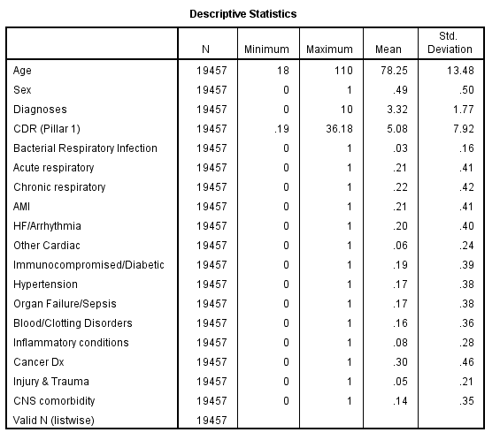 We now come to the bit where I have to predict the incidence of COVID in a sample of 19,457 adult in-hospital deaths using classic logistic regression. The groundwork for this was laid down in this article and I shall be doing the very same again, but with two exceptions: CDR will be replaced by CDR (pillar 1), and Vaccinated will be dropped.