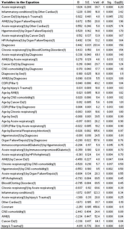 This listing of 18 main effects will yield 153 two-way and 816 three-way interactions. I still don’t have a tea pot big enough for all those three-way effects so stuck to two-way as my nod to model sophistication. Regular readers will have come across this listing umpteen times but it may be worth me mentioning once again that Diagnoses represents the total number of medical diagnoses made on the medical record, which may range from 0 to 10, this being a rough proxy for case complexity. CDR (pillar 1) is my newly-minted proxy for exposure to SARS-COV-2 in a hospital setting.