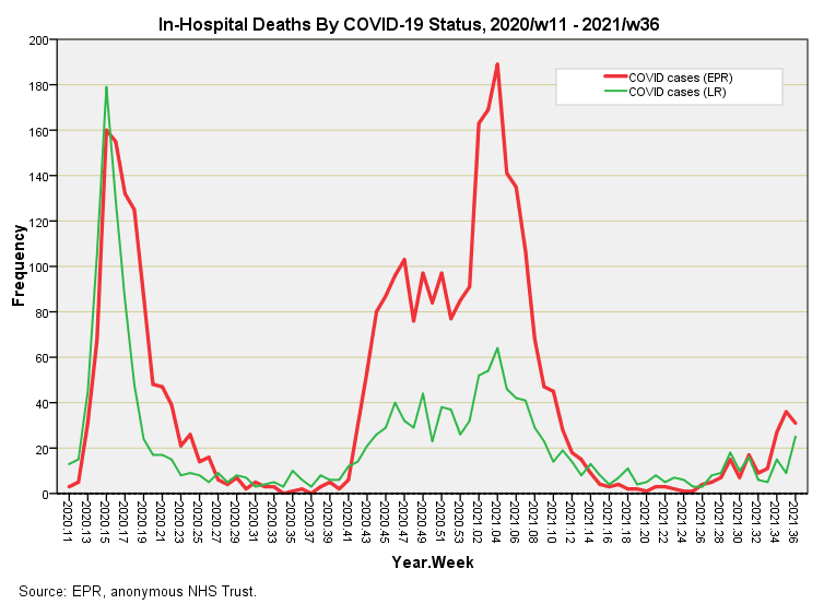 Vaccination status may not be a reliable indicator within the EPR owing to reliance on linking Trust-level and national-level data systems. Failure to specify a unique NHS number in both systems will result in a default coding of unvaccinated.