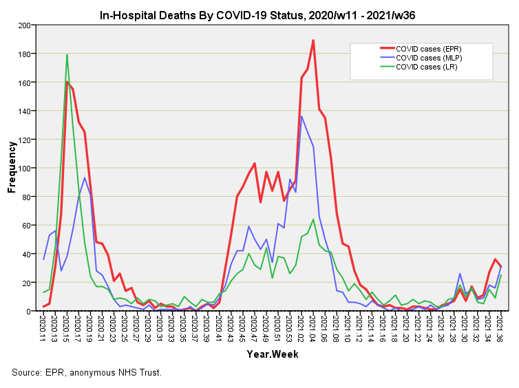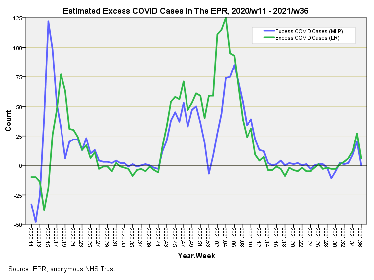 Two statistical methods (multivariate logistic regression and MLP machine learning) were used to predict COVID status prior to death in 19,457 in-patients over the period 2020/w11 - 2021/w36.