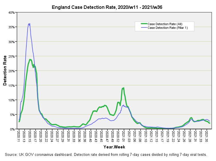 Up to now I’ve been using a concoction I’ve been calling case detection rate (CDR) as a proxy for disease prevalence. This has been forged by taking the UK GOV coronavirus dashboard variable newCasesBySpecimenDate, turning it into a rolling 7-day sum to iron out weekly administrative fluctuations, and dividing it by newVirusTestsBySpecimenDate, which has also been turned into a rolling 7-day aggregate. When beefed up into a percentage this has offered a useful proxy for disease prevalence for the nation of England on a daily basis, enabling me to broadly account for varying levels of exposure over time.