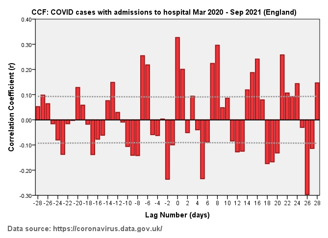 See that tall bar at lag -7 days reaching to r = 0.255? That is telling us there is a hike in admissions 7 days BEFORE a hike in new cases. How can this be? A clue comes from the regularly spaced positive spikes which again points to week-on-week administrative procedures rather than anything the virus may be genuinely doing. Thus people are being squeezed into hospital in an elective manner and the blame is being put on COVID if they happen to test positive i.e. we are not looking at a purely causal relationship in the numbers presented to the public.