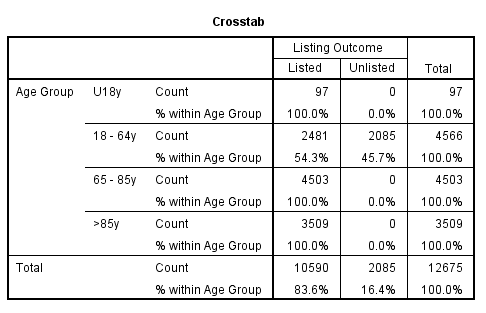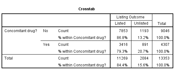 There is a reluctance for Cominarty to be listed as a suspect drug for those also in receipt of a concomitant drug, with a crude odds ratio of 1.6 (p<0.001; Fisher’s Exact Test, n=13,354). Concomitant drugs are generally those on repeat prescription with historical use for chronic conditions, examples being: Amoxicillin, Salbutamol, Aspirin, Citalopram and Insulin. Whilst this result is in line with expectation it does raise concern over yet more reporting bias.