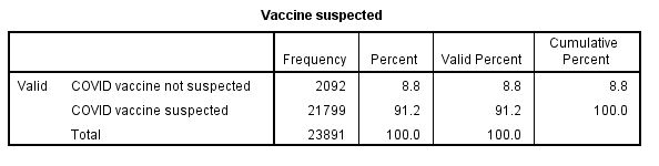 Not all COVID vaccinations were considered ‘suspect’, but the vast majority (91.2%) were, as may be gleaned from the table below. This split provides analysts with another wrinkle to iron out!