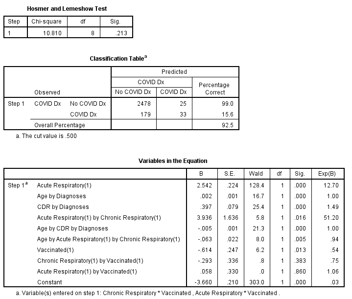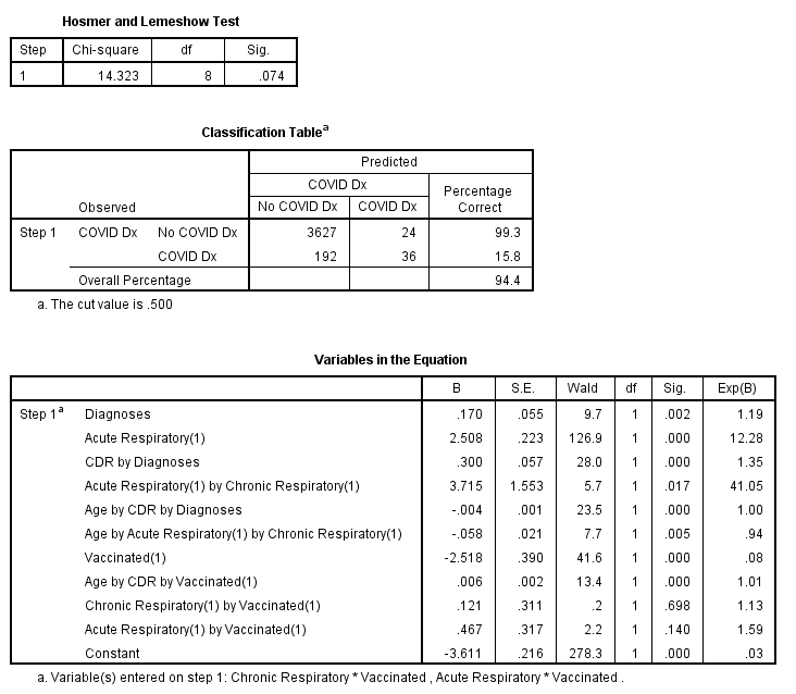 A classification table is always a good thing to throw down on the dinner table because it’s the ultimate acid test as to whether the model is doing anything useful. As we may see the model is very good at predicting absence of negative test results (99.0% true negative rate) but is pretty ropy at predicting presence of positive test results (15.6% true positive rate). The lesson we learn here is that COVID Dx, as a dependent variable, is a pretty tricky customer to predict and it’s worth cogitating on this, for it reveals just how ambiguous the real world is.