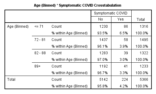 When cogitating on complex logistic regression output I always find it best to go right back to the raw data and do something utterly simple like crosstabulating the basic data. Here’s such a crosstabulation of binned age group by symptomatic COVID. If the bin values look a little odd that’s because these cutpoints arise from an automated procedure that provides four equal-sized groups or as near dammit: