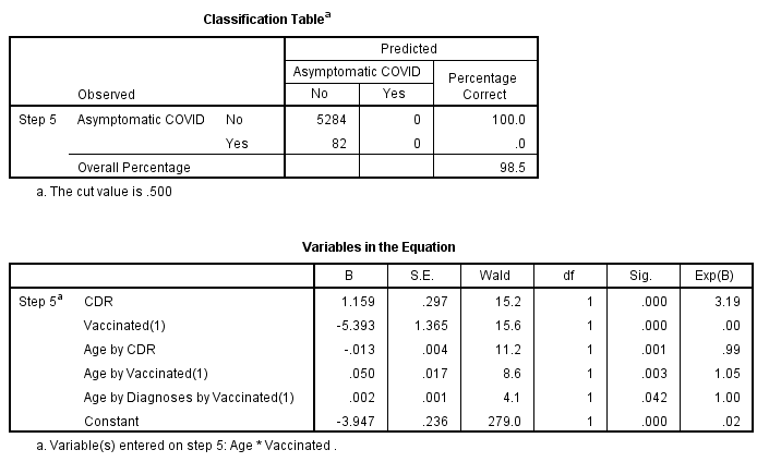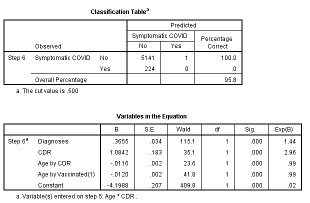 I’ve included the results for asymptomatic COVID even though the sample size is far too small for this sort of statistical work (82 cases) and the model utterly inadequate in doing anything but assuming nobody suffered from this condition (whatever asymptomatic COVID means in the real world apart from indicating a likely false positive test result). Given the nonsensical position we might just note two odds ratios slightly above unity for Age by Vaccinated (OR = 1.05, p=0.003) and Age by Diagnoses by Vaccinated (OR = 1.00, p=0.042), with the latter being a subgroup of the former. These indicate increasing risk of asymptomatic COVID with age and vaccination and although this result makes more sense (and points to potential vaccine harm) we can’t read too much into it.