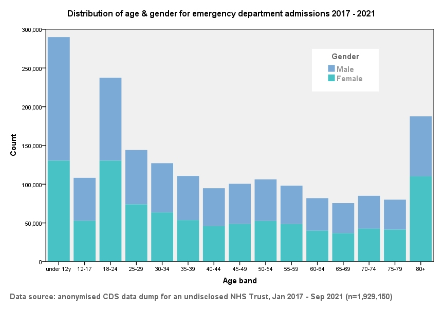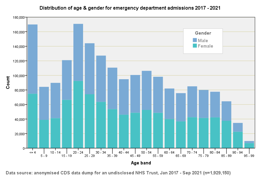 Sometimes I set aside all fancy number crunching and produce something simple and satisfying that carries more weight than I had anticipated. Like a cheese and onion crusty roll with a pint of ale sort of thing. This morning I had the notion to ponder on the age and gender profile of every admission to the emergency department for the period Jan 2017 – Sep 2021 and produce something in a pleasant pastel. Well here it is. I’ve used the same age banding as the ONS use for vaccination counts and rates so we may get a feel of just who is coming in through the front door in the first instance.