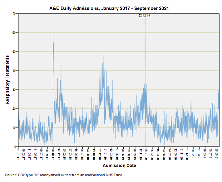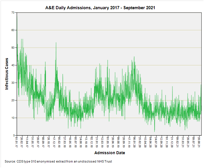There’s simply not enough of these cases to display on a daily basis so I’m going to present these as weekly counts in the next article in this series. This fact alone is worth cogitating on, and another thing we must cogitate on is that the meltdown in emergency service provision is going to bend the numbers like crazy. What we’ll need to do, therefore, is ogle a set of slides for the percentage of respiratory/infectious cases amongst all admissions in case this flushes out a swing that might be indicative of a respiratory pandemic. Straight bat and all that.