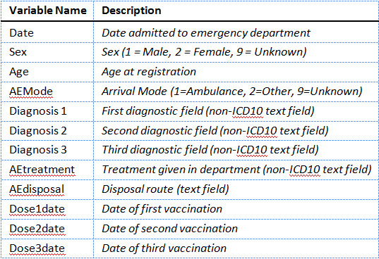 The CDS type 010 data extract I have sitting on my screen right now spans 1 January 2017 – 19 September 2021, there being 1,928,918 entries. Please note that an entry represents a visit to A&E such that somebody in a bad way health-wise might be represented in the database ten or more times over this period. Because the data are fully anonymised I have no way of converting visits to unique persons and this limitation needs to be born in mind for certain analyses. For example, diabetics are likely to require the services of A&E more so than those with arthritis and so will be over-represented in comparison. As for the raw data fields handed to me there are just 12, these being: