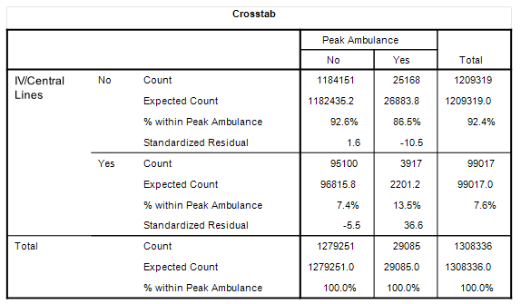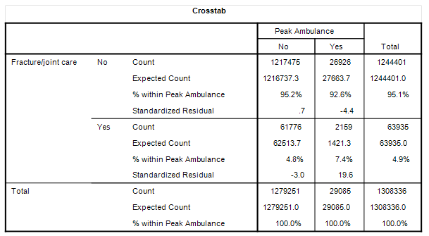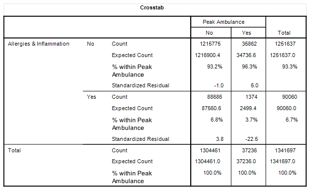 Crosstabulations of primary diagnostic category against the peak indicator didn’t reveal anything of great significance apart from the incidence of allergies and generalised inflammation whose admission rate plummeted from 6.8% of diagnosed admissions to 3.7% of diagnosed admissions: