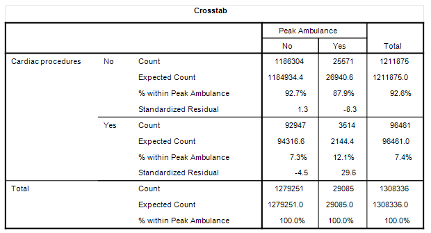 In terms of treatments administered in A&E during the peak period there are a quite few interesting points of note. Firstly, we observe an elevated requirement for cardiac procedures at 12.1% incidence rate compared to 7.3% (p<0.001), even though incidence of cardiac conditions changed very little from 5.6% outside of peak to 6.3% during peak: