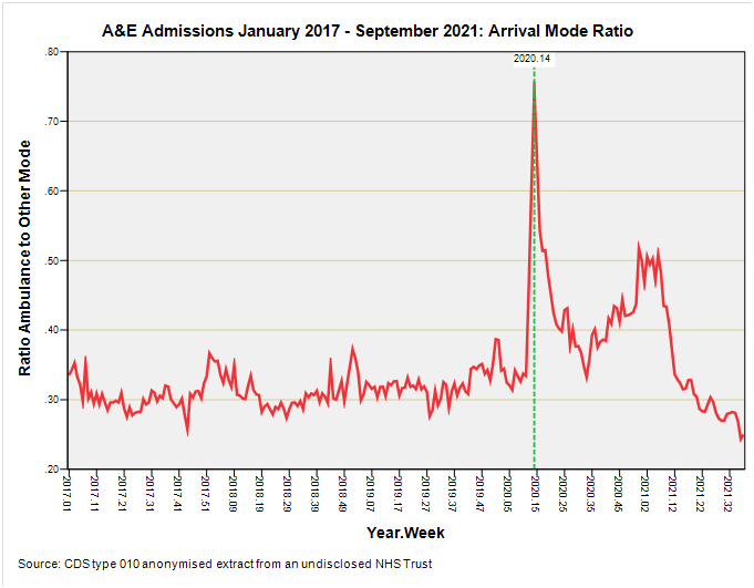 Now this is darned interesting. As we have noted in part 4 of this series private and public forms of transport are typically how the majority of people travel to their nearest A&E but this was decidedly not the case during 2020/w14 (week ending 3 April) when emergency ambulance use suddenly surged.