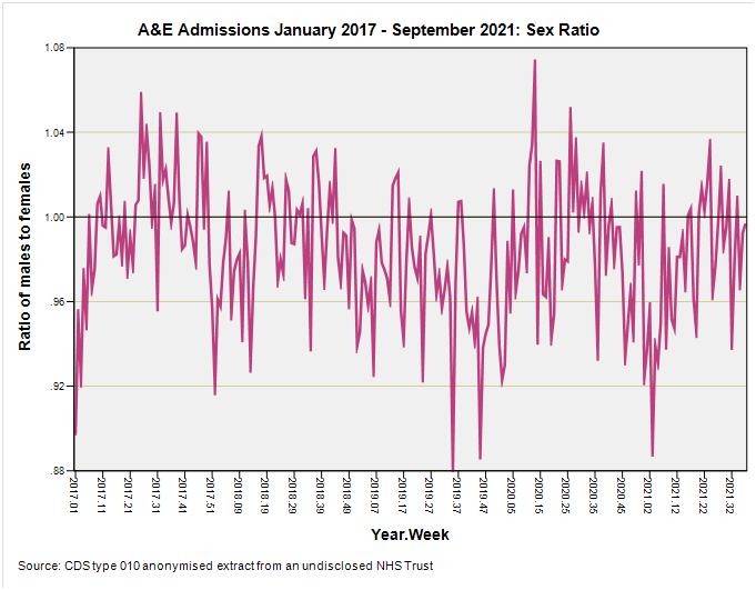 I analyse an anonymised data dump of 1.9 million admissions records to the emergency departments of an undisclosed NHS Trust for the period June 2017 – September 2021